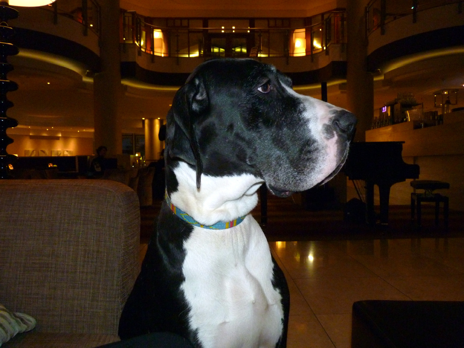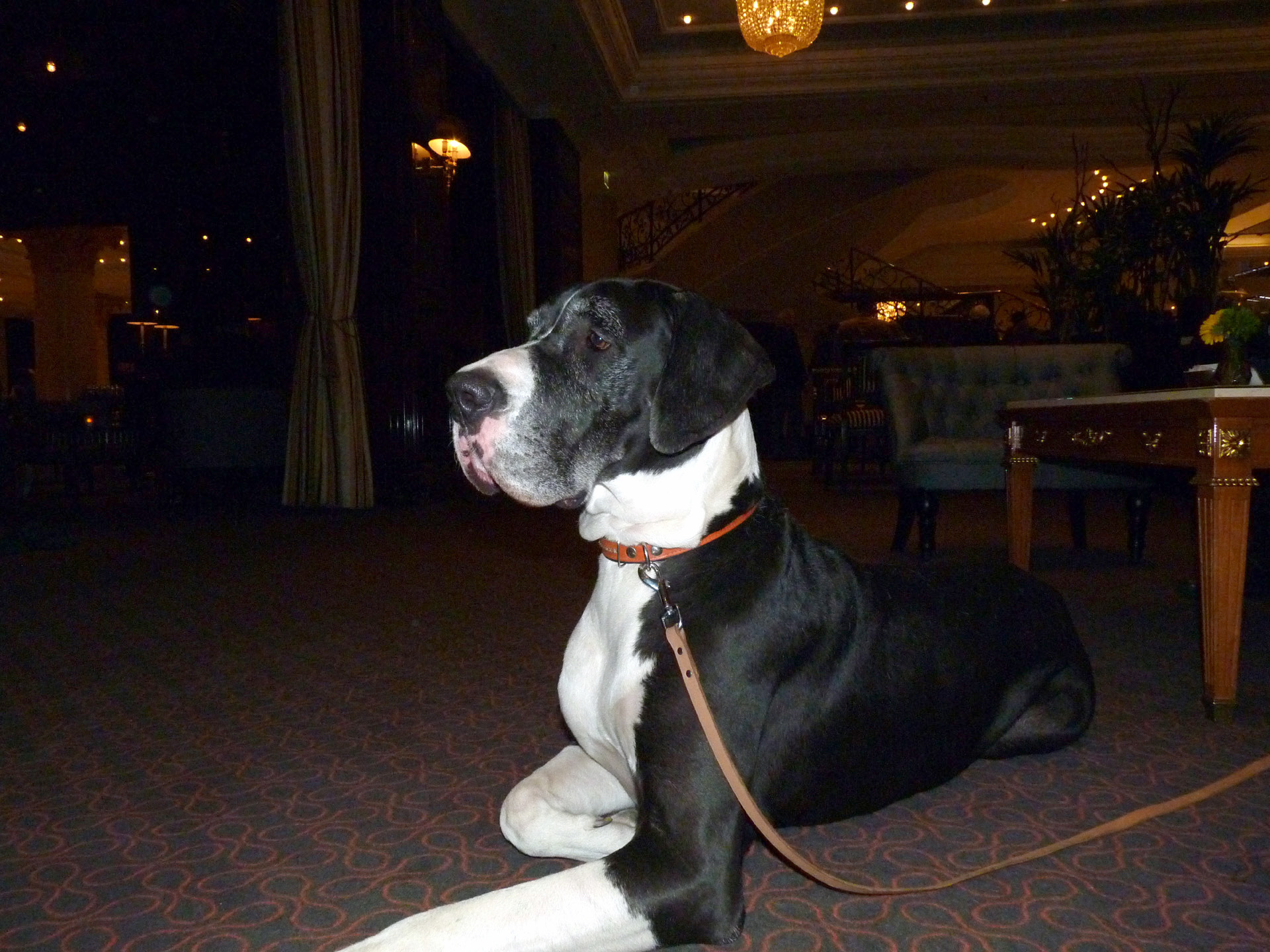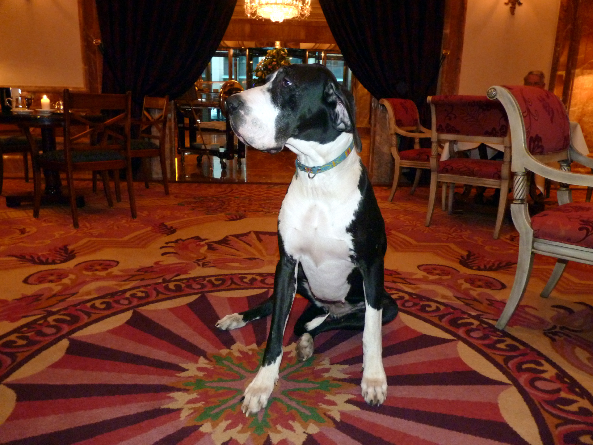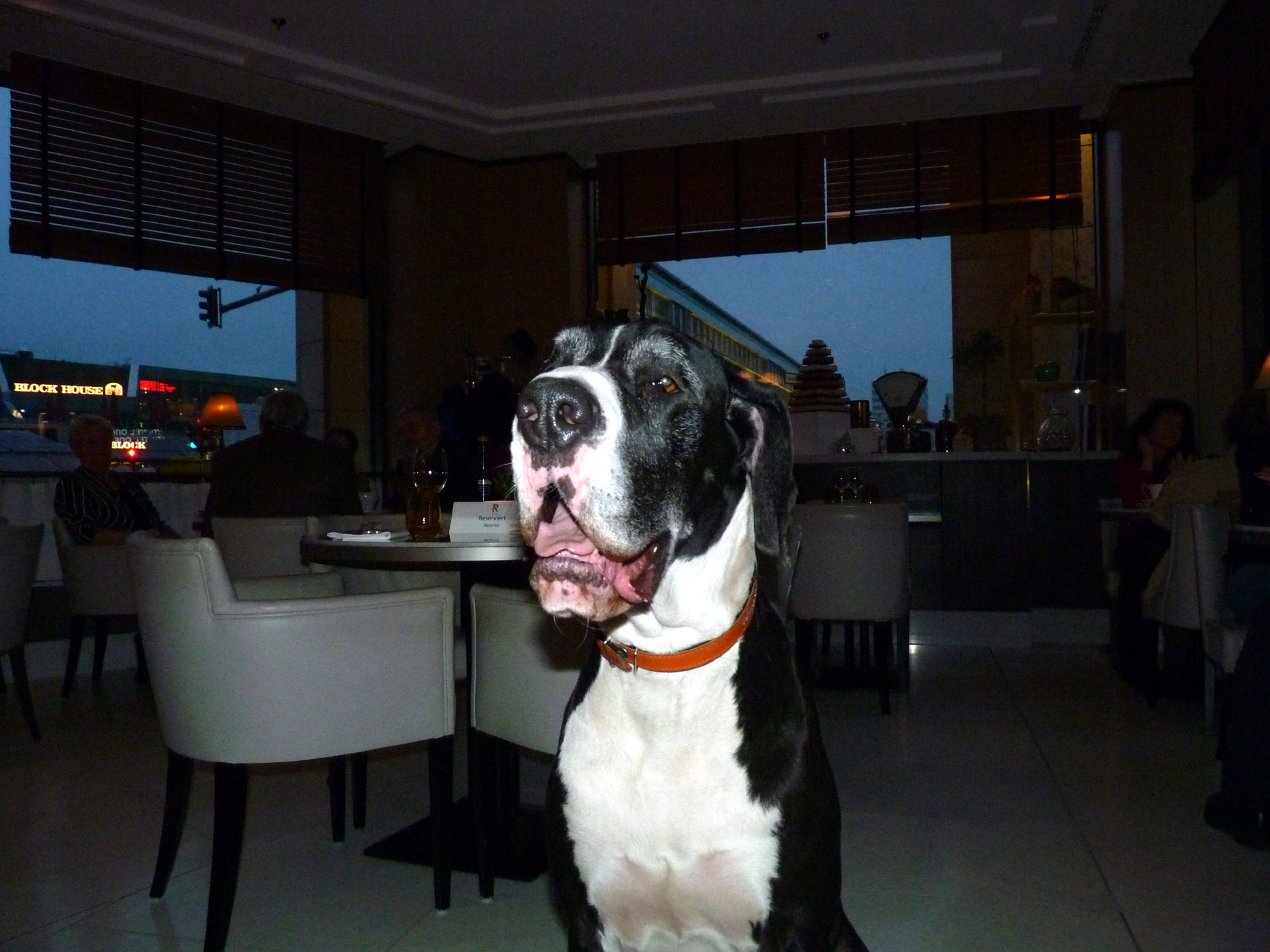Um die Deutsche Dogge als Gesellschaftshund zu testen ist es nötig die Deutsche Dogge an Orte zu bringen die stark kontrolliert werden. Hier bieten sich in Berlin eine Fülle von Luxushotels an. Diese sind zwar für ihre eigenen Hotelgäste absolut offen, die allgemein öffentlichen Bereiche, Lounge (Lobby), Bars, Cafe's und Restaurants werden in den meisten Fällen bereits am Eingang des Hotels durch einen Portier und nachfolgend von Security-Personal kontrolliert. Dabei geht es natürlich in erster Linie um die Sicherheit des Hotels aber auch um das Anliegen des Besuchers. Nach meiner Erfahrung werden hier bereits das Wesen und die Folgsamkeit der Dogge, und der gesamte Eindruck von Hund und Herrchen begutachtet. Beim Hotel "Adlon" in Berlin kommt dann noch eine gewisse Abschirmung prominenter Hotelgäste hinzu. Der Einlaß in ein Luxushotel ist aber nur eine Seite eines Tests der Gesellschaftsfähigkeit der Dogge. Man trifft dort aber auch Hotelgäste mit kleinen Gesellschaftshunden (u.a. Jack Russell Terrier) denen man kaum aus dem Weg gehen kann. Insbesondere dann nicht, wenn sie mit ihrem Hund an den Tisch mit der Dogge kommen damit beide Hunde sich kennen lernen können. Bisher konnte ich in solchen Situationen gelassen bleiben, da meine Doggen keinerlei Aggression zeigten. Auch ein Knurren der Dogge ist in solchen Situationen absolut fehl am Platz. Die Berliner Luxushotels sind also ideale Orte um die Gesellschaftsfähigkeit eines Hundes zu testen. Die Angestellten dieser Hotels sind zwar freundlich, werden aber kein Risiko für's Hotel eingehen. Die Fotos wurden genehmigt, in der Regel mit der Bitte keine Hotelgäste mit ins Bild zu nehmen.
