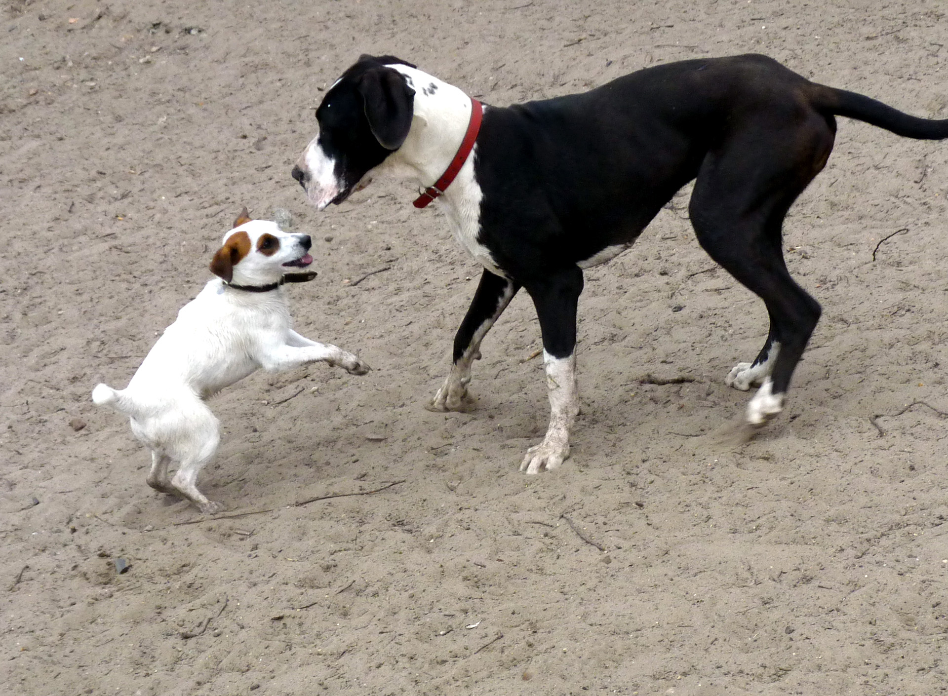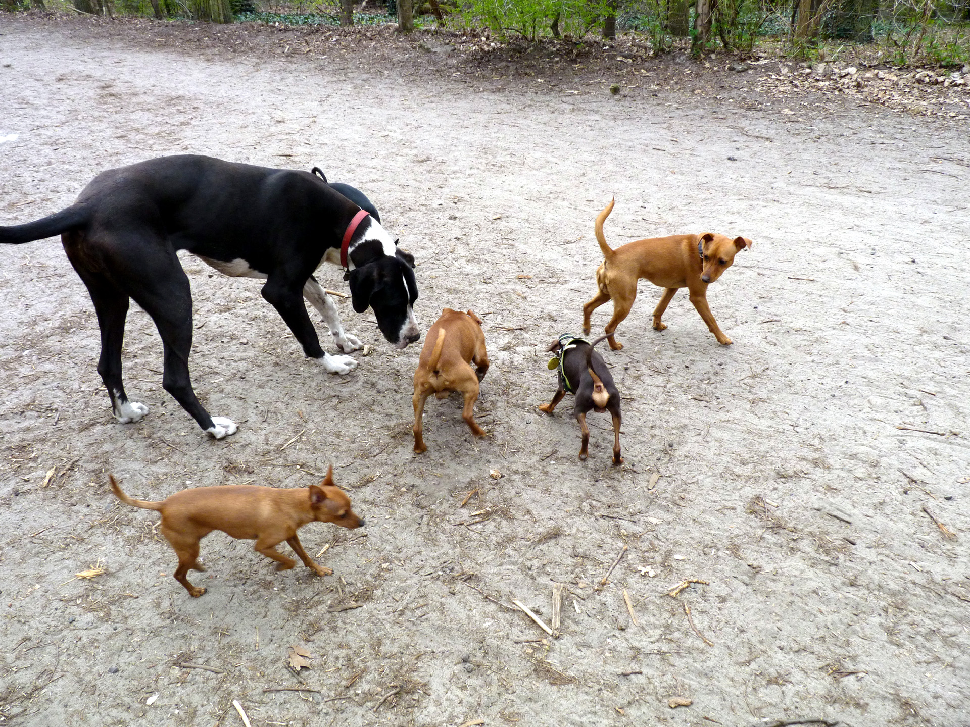 Ein sehr gutes Zusammentreffen kleiner Hunde mit Nachwuchsdogge Jarina. Die Kleinen sind sehr gut sozialisiert u. zeigen sich selbstbewußt, aber neutral der Deutschen Dogge gegenüber. Leider ist das nicht die Regel. Ein Kompliment an den Halter der Kleinen. Sie wurden sehr gut auf die Praxis vorbereitet. Nachwuchsdogge Jarina kennt kleine Hunde und nähert sich entsprechend behutsam, denn Neugierde u. das Verlangen die Kleinen zu kontrollieren dominieren. | Es gibt aber auch Vertreter kleiner Rassen, die sich großen Hunden gegenüber respektlos verhalten. Sehr oft kommt es aus Angst zu aggressiven Abwehrreaktionen. Damit sollte jede Deutsche Dogge umgehen können. Auch wenn ein kleiner Hund einmal in die Lefzen beißt, sollte die Deutsche Dogge niemals ernsthaft kontern oder gar den Kleinen als Beute betrachten. Die Lösung des Konfliktes ist denkbar einfach. Der große Hund braucht nur einen Schritt zur Seite zu gehen. Die Kleinen fürchten nur die Nähe des Großen. Eine Deutsche Dogge hat, wenn sie als Welpe sehr gut sozialisiert wurde gelernt, dass sie durch "Abwehrbeißen" nicht direkt bedroht wird. Im schlechtesten Fall wird der Kleine zur Beute. Eine sogenannte "hohe Reizschwelle" der Dogge hilft rein gar nichts, wenn ein potentieller Angreifer zur Sache geht. | |