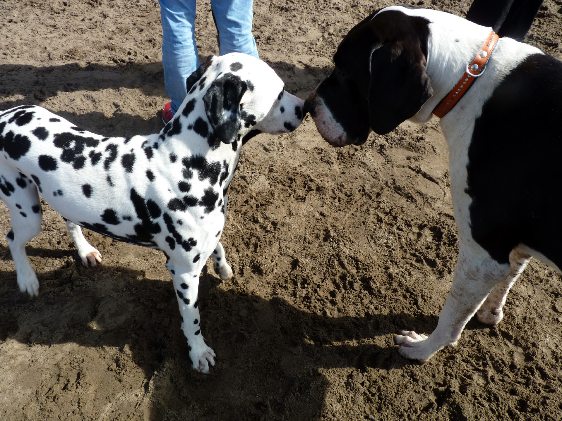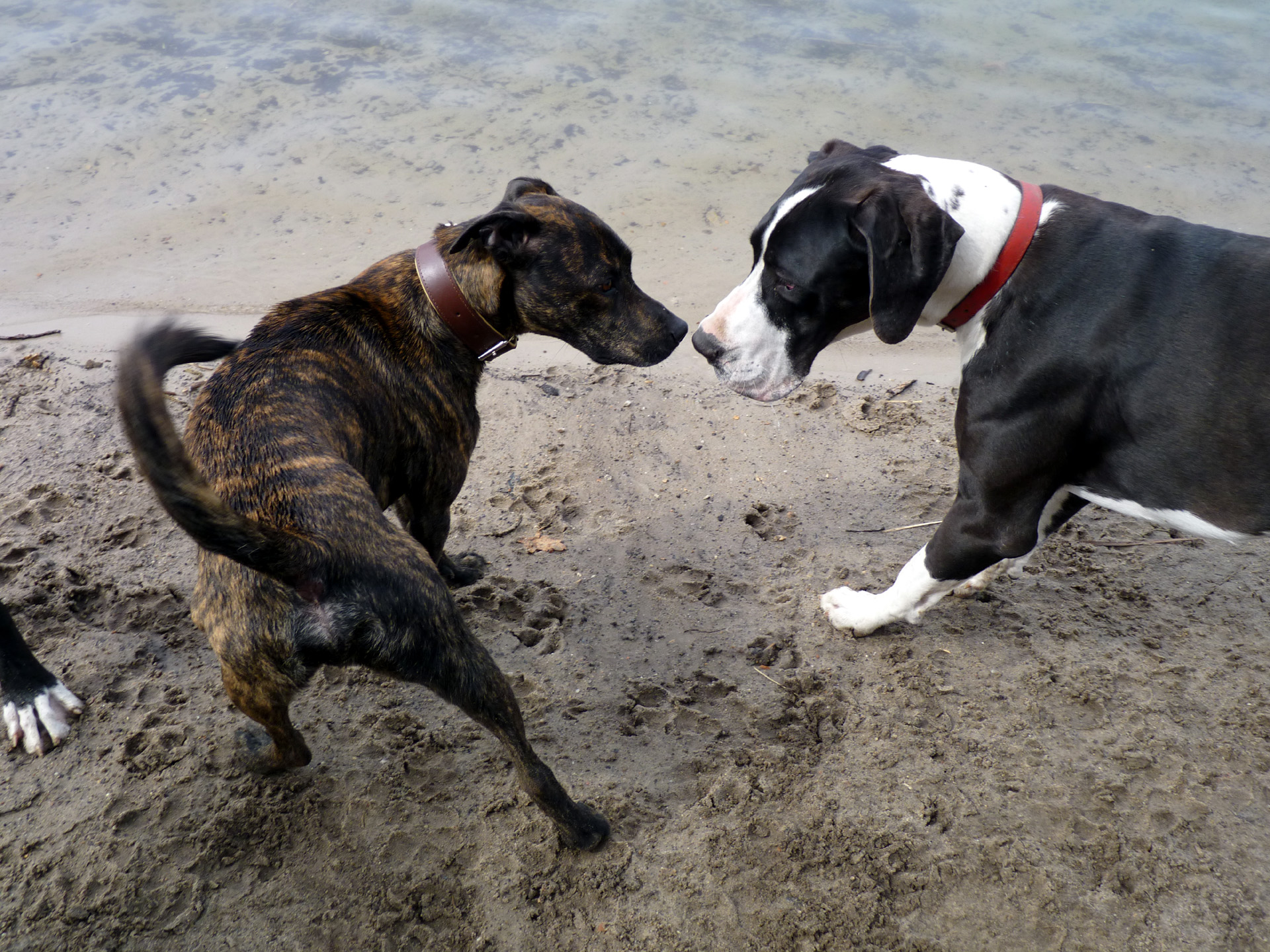 Erste Kontaktaufnahme - Die aufgestellte Rute signalisiert Anspannung, nichts ist entschieden | Beide Hunde haben sich gleichzeitig entschieden ihre Fitness im Spiel zu testen. | |